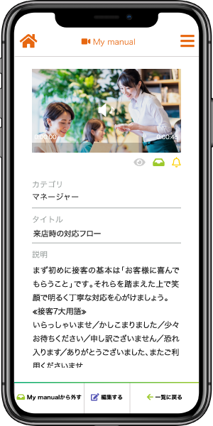• 精度の高いマニュアル動画で事前学習し、貴重な実践の場で最大限のパフォーマンスを発揮。1本5分程度の動画なら空き時間や自宅帰宅後など何度でも復習できるので自信を持って担当できるように。